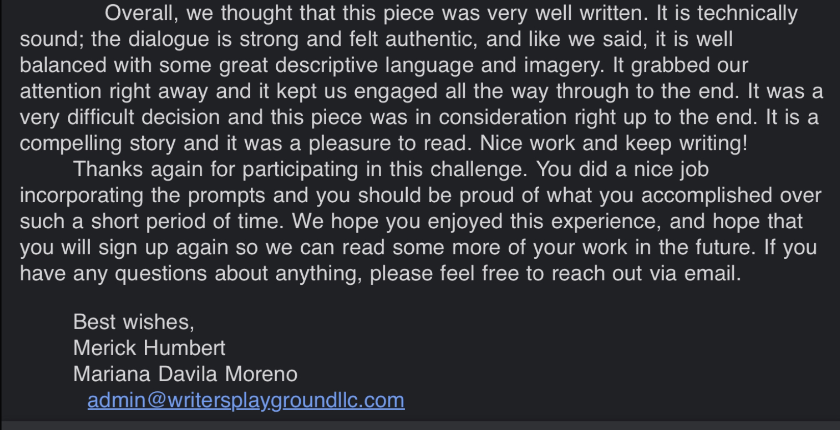 The story didn’t place or receive an honorable mention, but I received great feedback from Writer’s Playground. I’m proud of the piece and think I see areas where I can make improvements. Always more to do! Onward and upward!